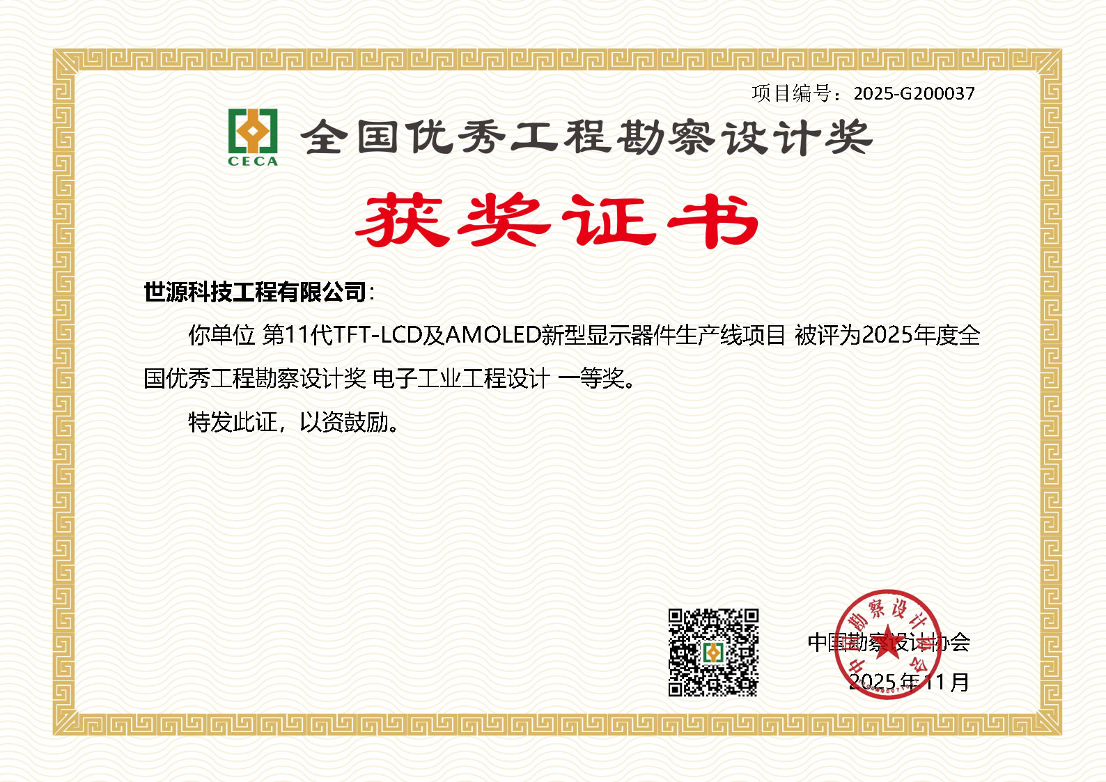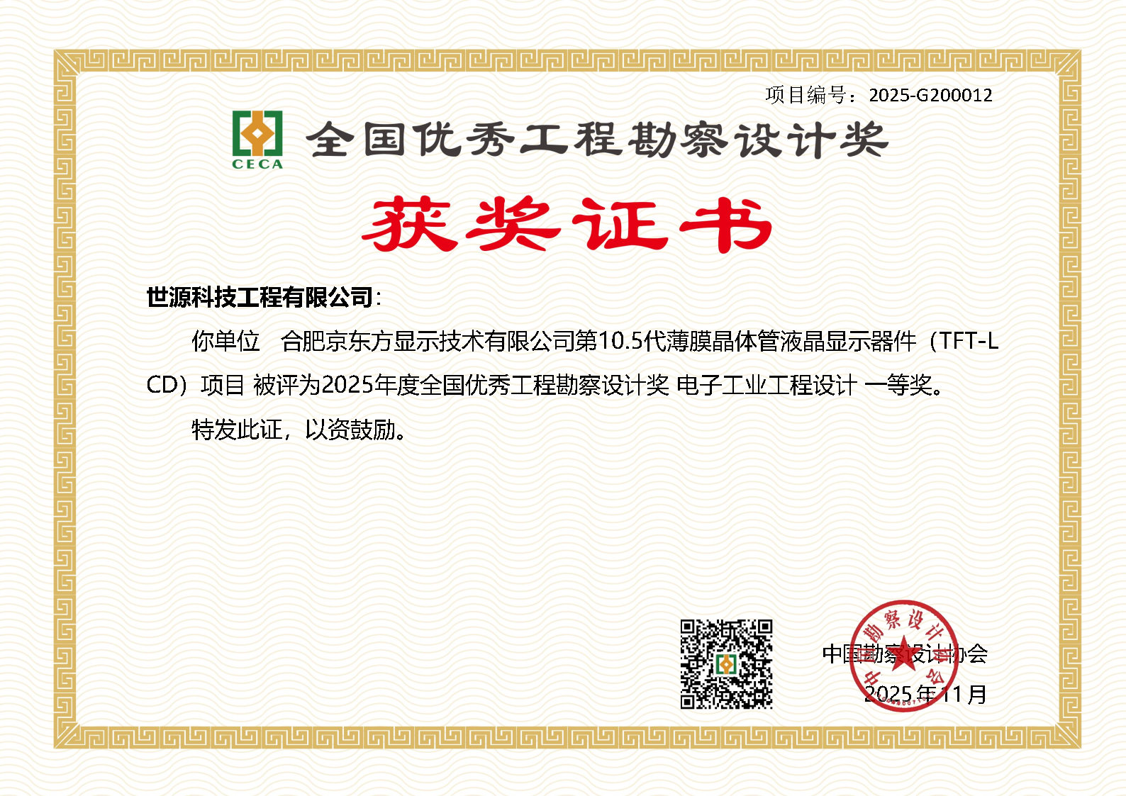 2025中设协全国优秀工程勘察设计奖一等奖—第11代TFT-LCD及AMOLED新型显示器件生产线项目