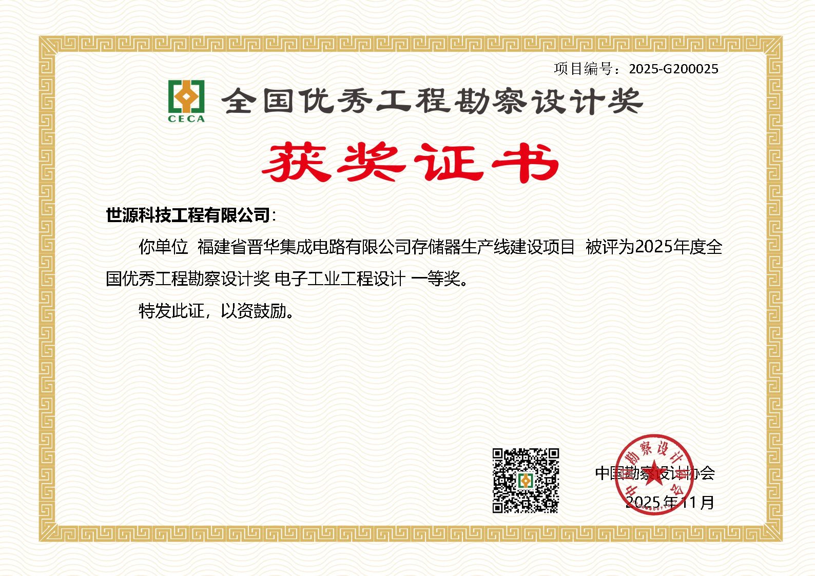 2025中设协全国优秀工程勘察设计奖一等奖—福建省晋华集成电路有限公司存储器生产线建设项目
