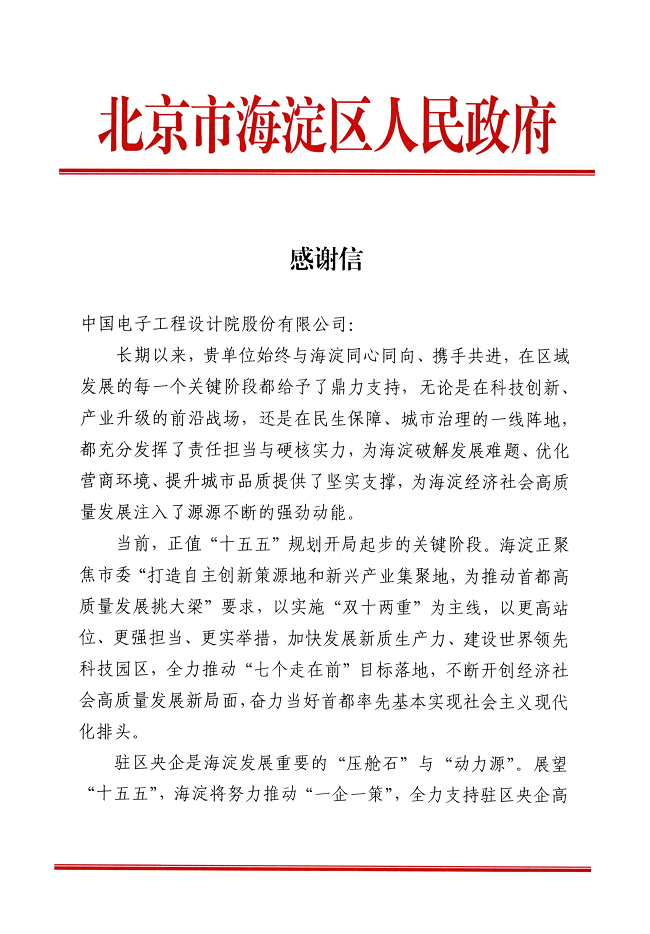 感谢信既是肯定,更是期许。中国电子院将继续加强与海淀区在科技攻关、人才培养、产学研合作等方面的深度协作,依托海淀区优质的教育资源与创新生态,用足用好“一企一策”,在政策匹配、场景开放、人才支持等重点领域,持续深化合作,在更宽领域、更深层次探索央地协同创新新路径,为服务首都高质量发展、实现高水平科技自立自强做出新的更大贡献。
