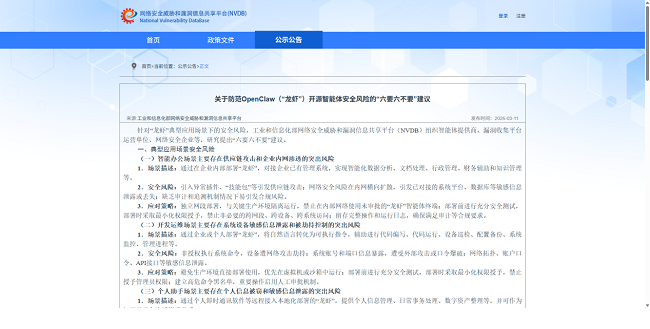 2026 年 3 月 11 日,工信部发布开源 AI 智能体 OpenClaw(“龙虾”)安全预警,指出其在智能办公、开发运维、个人助手三大场景存在供应链攻击、内网渗透、信息泄露、合规缺失等风险,给出部署隔离、权限管控等应对策略,并发布 “六要六不要” 安全使用建议。